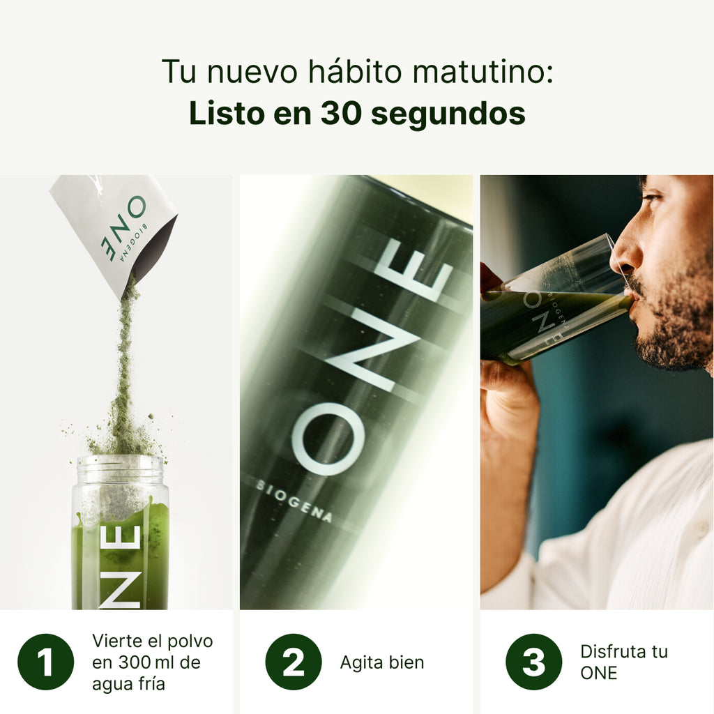 Incorpora BIOGENA ONE a tu rutina diaria, ya sea por la mañana o a lo largo del día. Gracias a nuestro práctico sobre diario, ONE te acompaña allá donde vayas.