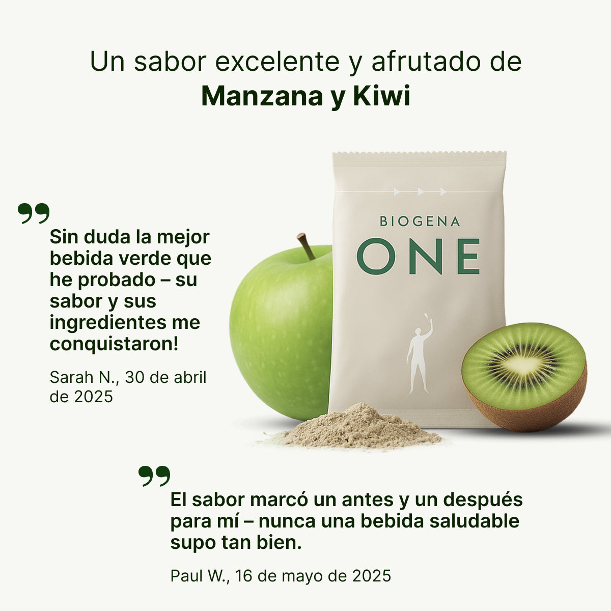 «Llevo probando Biogena ONE algo más de seis semanas y estoy muy satisfecho. Tiene un efecto muy positivo en mi digestión y también siento que estoy mejor nutrido en cuanto a minerales. Durante este tiempo, he notado una clara mejora en el estado de mis uñas y mi cabello. Mi recuperación después del ejercicio también es notablemente mejor. Es fácil de usar y tiene un ligero sabor dulce a manzana y kiwi. Sabe realmente refrescante con agua fría.»