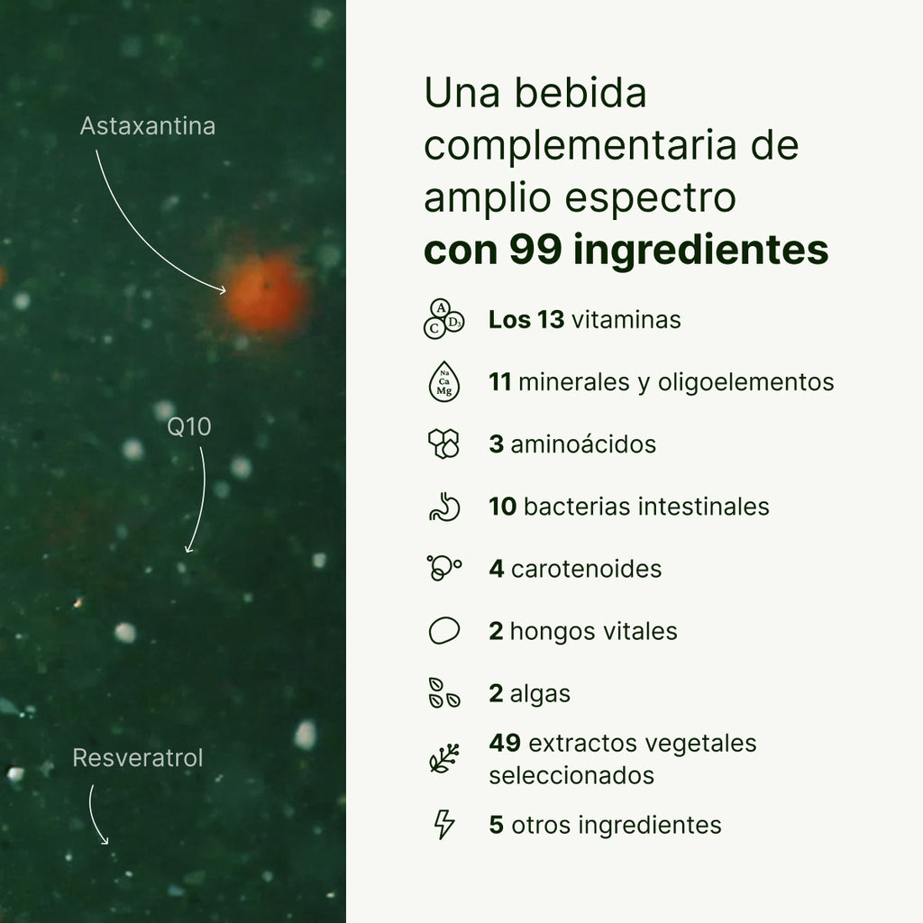Polvo de manzana, aromas naturales, citrato de potasio, polvo de pepino (7,6 %), carbonato cálcico, citrato de magnesio, L-ascorbato de calcio, acidulante: ácido cítrico, polvo de kiwi, Spirulina platensis (contiene sulfitos), inulina de raíz de achicoria, polvo de hoja de moringa, L-glutamina, fibra de acacia, polvo de hierba de cebada, polvo de hierba de trigo, polvo de zanahoria, polvo de lactobacilos y bifidobacterias***, polvo de menta verde, pulpa de fruto de baobab, polvo de espinacas, extracto de brócoli, polvo de fruto de açaí, polvo de apio, polvo de col rizada, polvo de Chlorella vulgaris (contiene sulfitos), ubiquinol (contiene soja), taurina, clorhidrato de L-lisina, polvo de hoja de wasabi, polvo de papaya, polvo de zumo de acerola, polvo de matcha, polvo de reishi (Ganoderma lucidum, contiene sulfitos), nicotinamida, extracto de amla, acetato de D-alfa-tocoferilo, extracto de bambú (contiene silicio), betaglucanos de levadura (Saccharomyces cerevisiae), extracto de brócoli, extracto de arándano, extracto de grosella negra, zumo de alcachofa en polvo, extracto de melón amargo, extracto de raíz de ginseng, polvo de hoja de ginkgo, extracto de maca, extracto de gel de aloe vera, extracto de semillas de calabaza, extracto de ortiga, polvo de cordyceps (Cordyceps sinensis), oleorresina rica en astaxantina procedente del alga Haematococcus pluvialis, betacaroteno, D-pantotenato cálcico, bisglicinato de zinc, gluconato de manganeso, menachinona, edulcorante: sucralosa; quercetina, colecalciferol, extracto de granada, extracto de semilla de uva (Vitis vinifera), extracto de uva (contiene dióxido de azufre), extracto de hoja de olivo, bioflavonoides cítricos, extracto de raíz de jengibre, extracto de diente de león, extracto de lúpulo, extracto de romero, extracto de tomillo, extracto de orégano, extracto de hoja de salvia, extracto de lavanda, extracto de hoja de eucalipto, extracto de hinojo, extracto de raíz de Astragalus membranaceus, extracto de pimentón (contiene zeaxantina), licopeno (del tomate), molibdato de sodio, selenito de sodio, clorhidrato de piridoxina, riboflavina, mononitrato de tiamina, ácido bórico, extracto de caléndula (contiene luteína), extracto de azafrán, bisglicinato de cobre, 5MTHF-glucosamina, hidroxocobalamina, picolinato de cromo, D-biotina, trans-resveratrol.