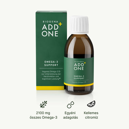 Magas dózisú omega-3 zsírsavak növényi eredetű DHA+EPA algából. Tökéletes kiegészítésként fejlesztve a BIOGENA ONE mellé a kognitív teljesítmény és a szívműködés támogatására.